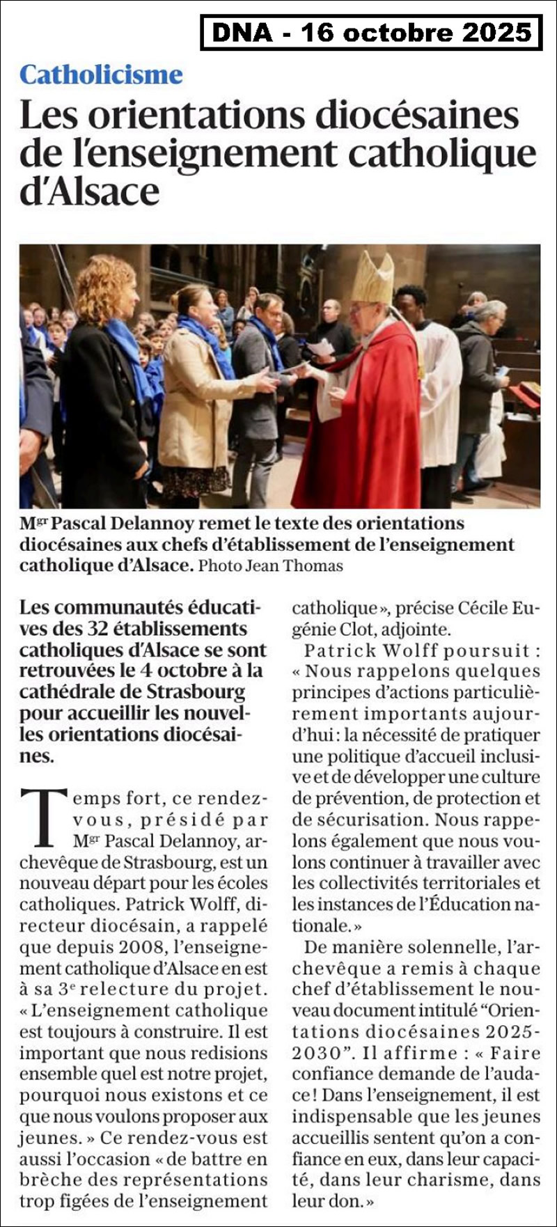 Samedi matin4 octobre 2025 au matin s’est tenue à la cathédrale Notre-Dame de Strasbourg la proclamation des nouvelles orientations diocésaines pour l’enseignement catholique d’Alsace.