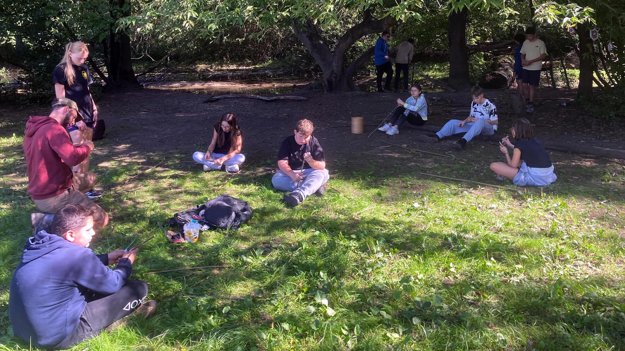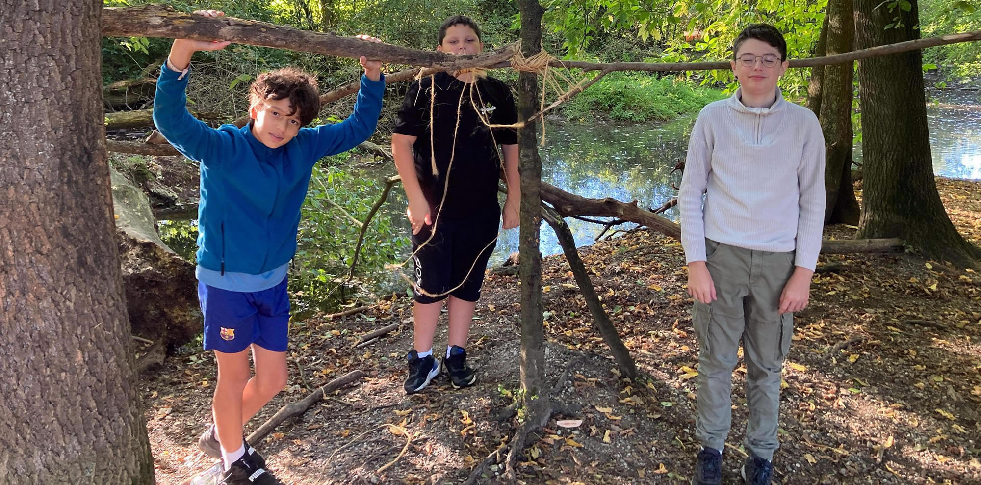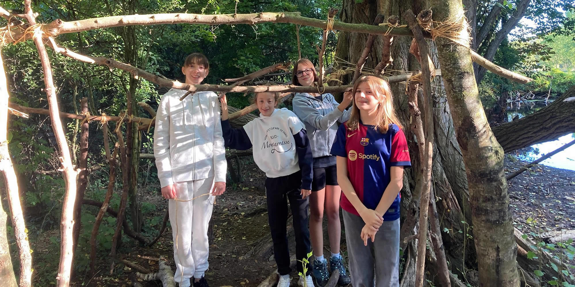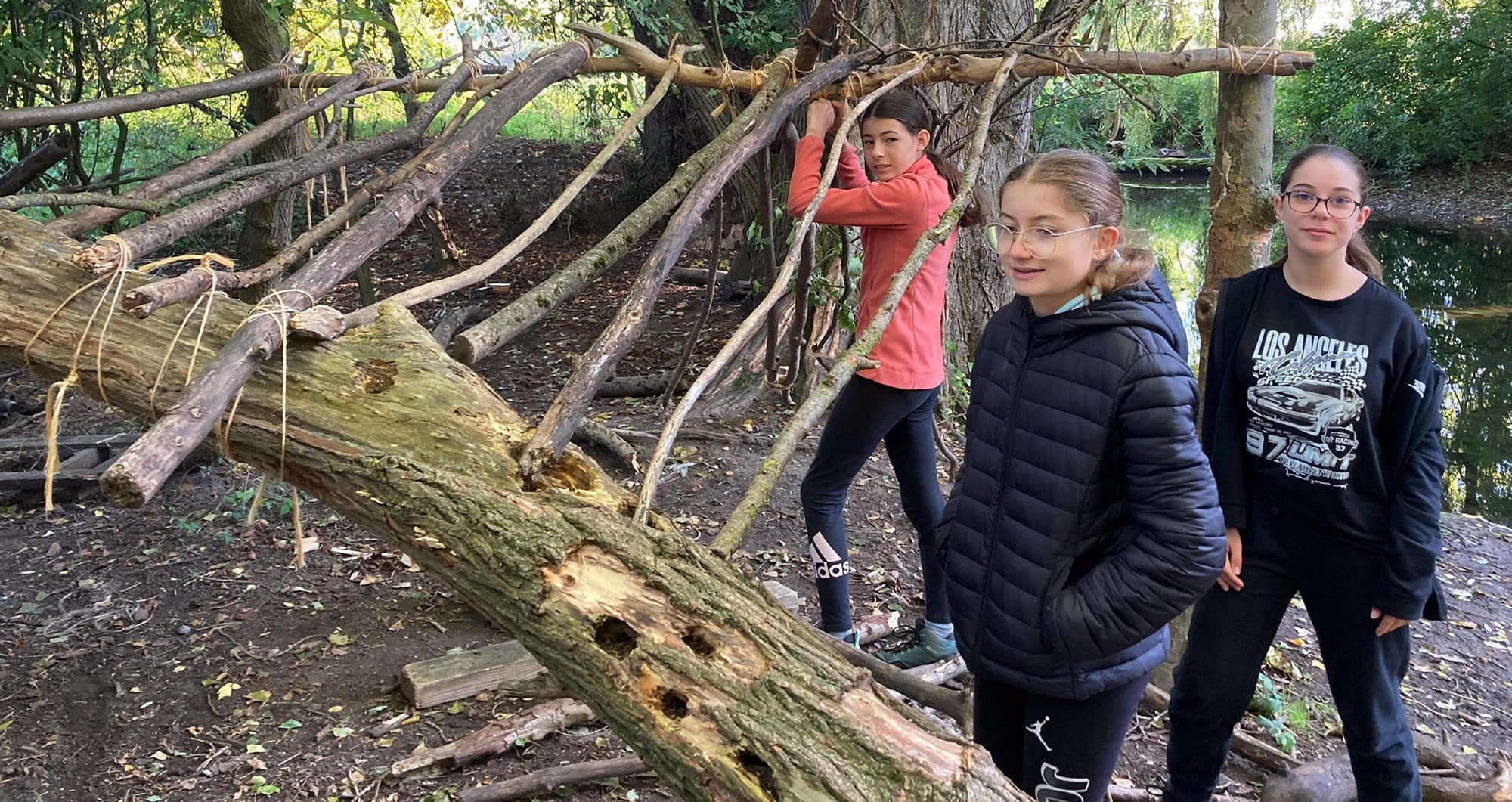 Séjour à Muttersholtz – Ramassage de bois et apprentissage des nœuds pour les bases d’une cabane solide… hâte de voir le résultat !