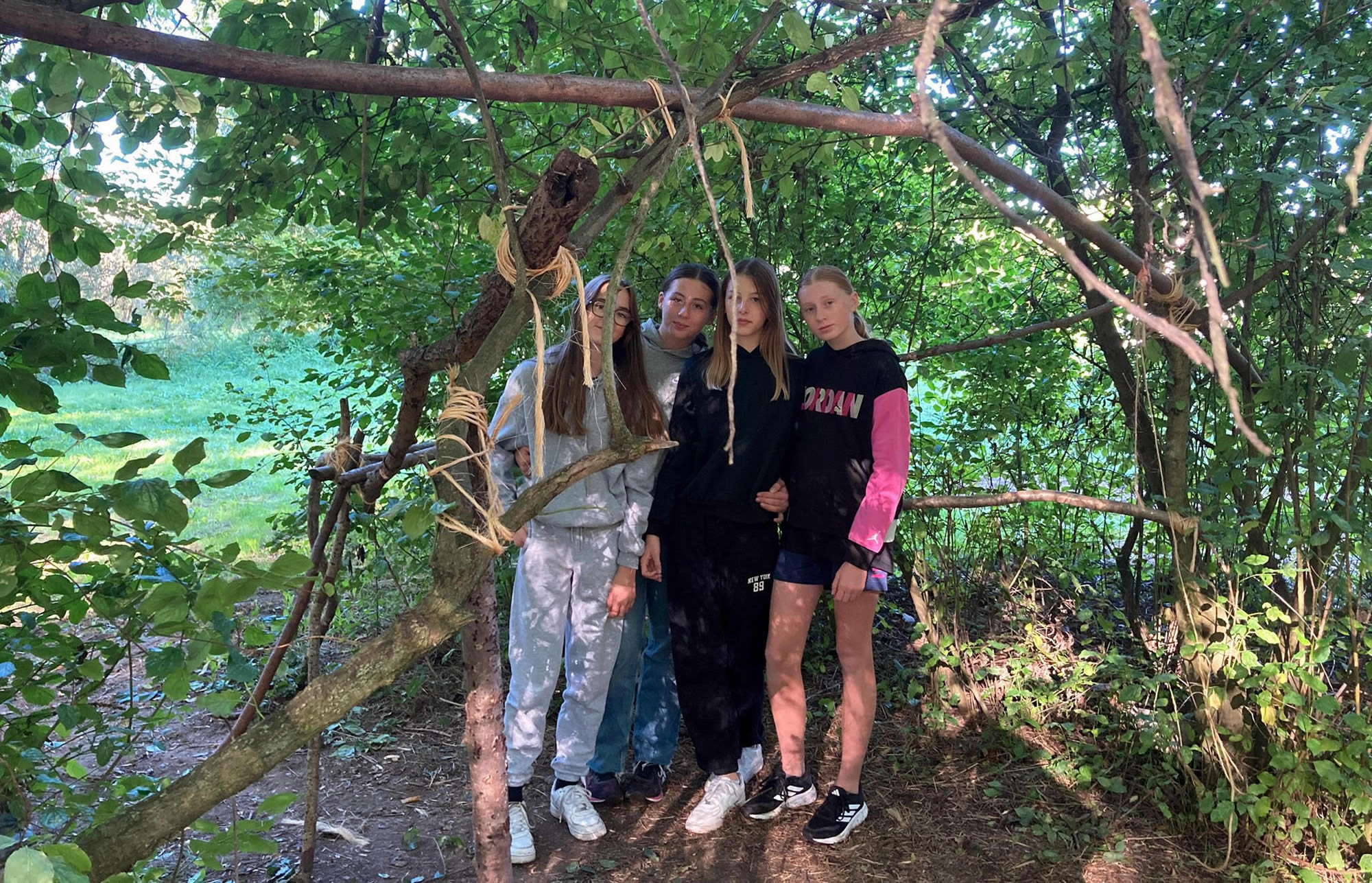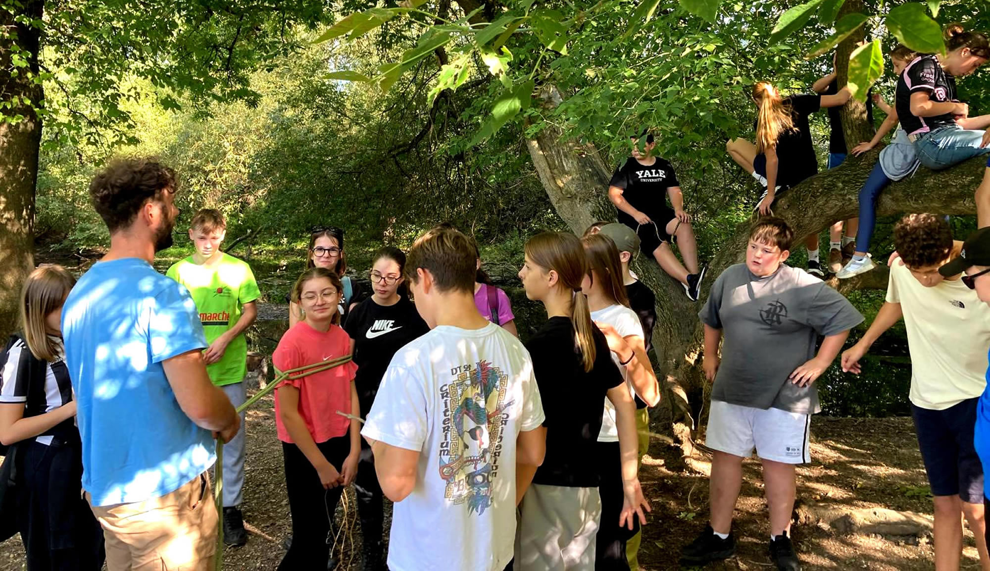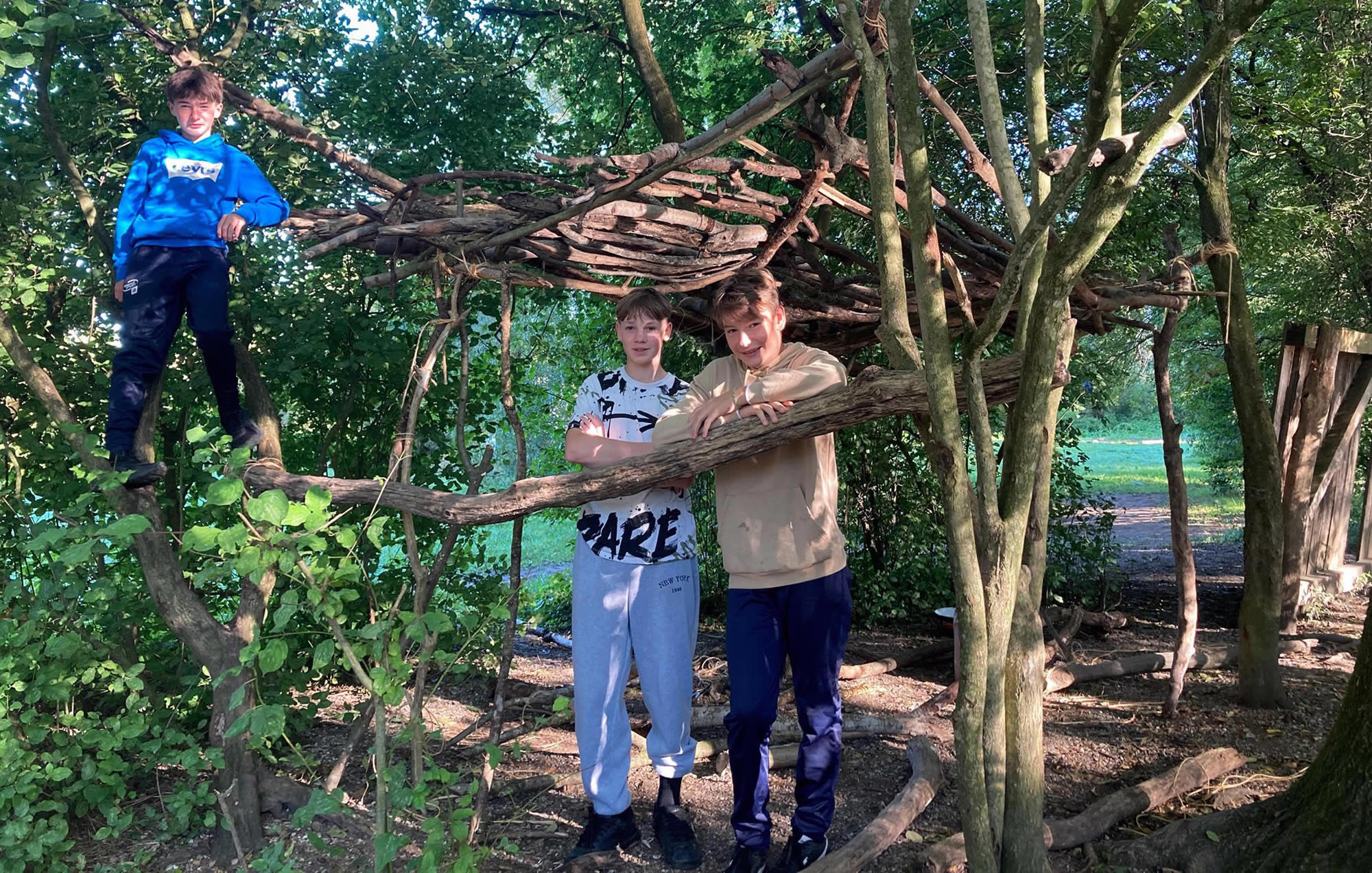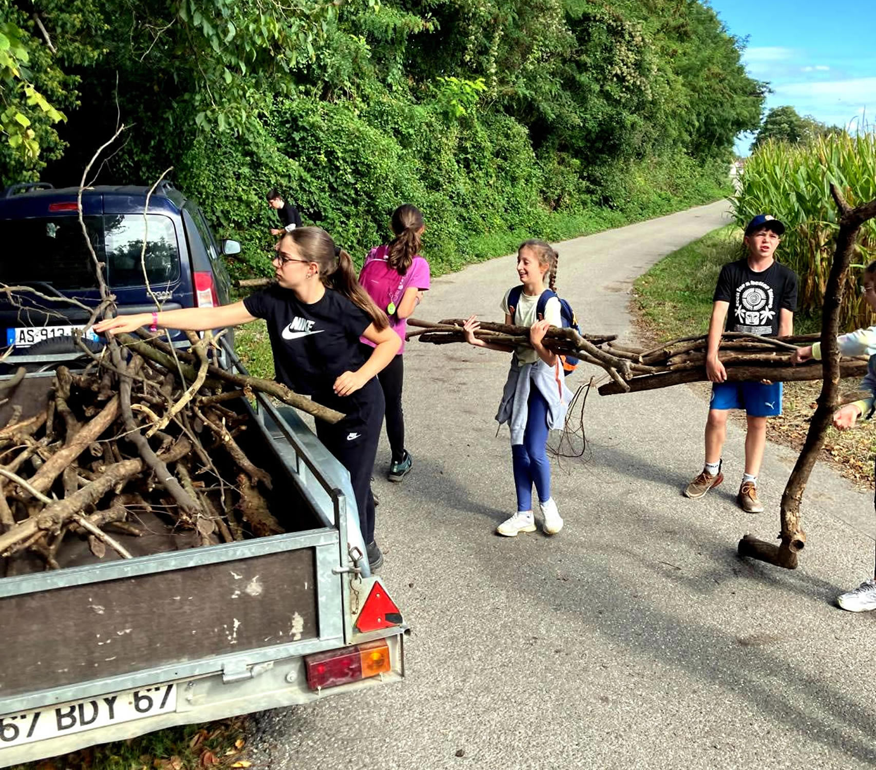 Séjour à Muttersholtz – Ramassage de bois et apprentissage des nœuds pour les bases d’une cabane solide… hâte de voir le résultat !